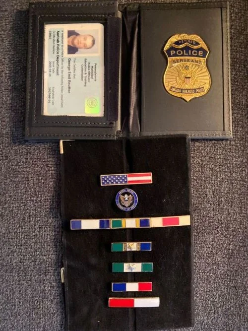 Retired Amtrak Police Sgt George Reutter retirement shield and medals