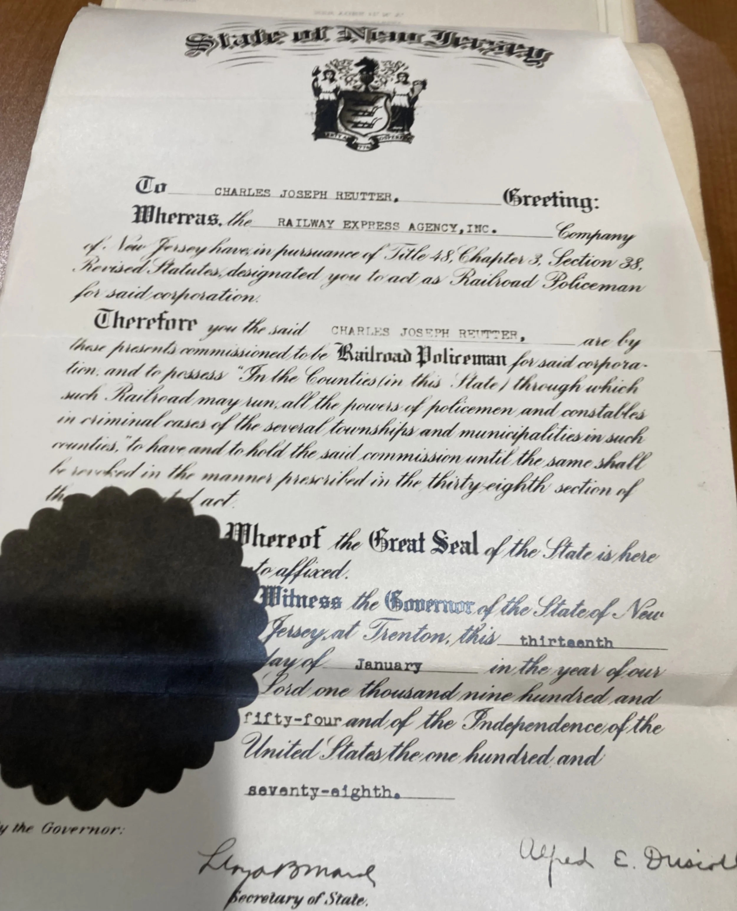 Researching our early Railroad Police history can often be very challenging. Chasing down artifacts, documents and clues. The war years I’ve found to be a fascinating puzzle at times. I was able to join two pieces together which now opens more questions. During WWII the Pennsylvania Railroad had an “Auxiliary Police” force. Mainly due to war time man power shortages, some railroads hired part time officers, usually women to cover the positions that needed to be protected. Several years ago I was able to obtain an Auxiliary Police uniform from the PRR complete with patches. A few years later I found an Auxiliary Police Commission from the PRR dated 1943. Beautiful patriotic flags. But if you look closely the commanding officer of the force held the rank of “Colonel” and his adjunct was a “Major” which are both military ranks. The commission was made out to a Sergeant in “M” company. So were these US Military personnel or civilians? It kind of reminds me of the movie “National Treasure” with Nicholas Cage. Every time you find one clue you’re looking for the next one!