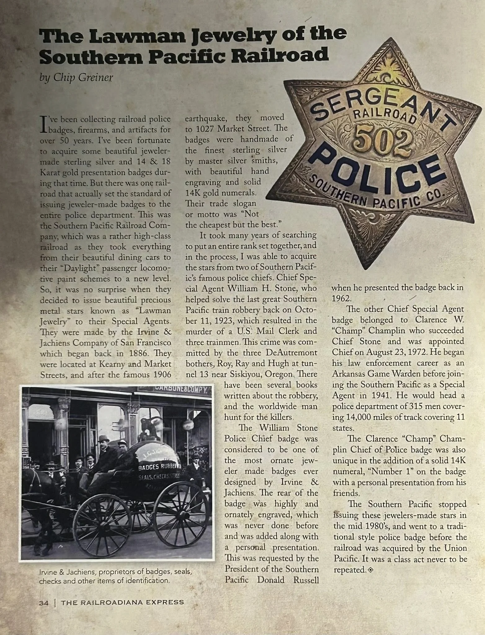 This is the completion of a journey or quest that started 18 years ago with my acquisition of a 14k gold badge that once belonged to Rock Island Railroad Chief Special Agent John H. Burnett. I got the badge from a friend, John Hopkins, who owns a pawn shop out in a Oklahoma City. He would often come across solid gold or sterling silver badges that walked into his shop. This was the case with this badge. It was a large 14K gold badge with a nice sized diamond at the botttom and a presentation from 1923 on the rear. I love solid gold presentation badges so this one was a must have. After acquiring the badge I contacted another friend, Ed Pavey who is Director of the Kansas State Law Enforcement Training Academy and asked if he could find any info on "Burnett" since he worked in Kansas and Oklahoma as a Special Agent for the Rock Island Railway. It didn't take long for Ed to locate a photo of Chief Burnett from an old Kansas State Lawmen yearbook directory. That was a home run! I now had a photo to go along with the badge. Nothing more happened until about 8 years ago when I decided to put a few of my better 14K gold railroad police badges up on a website called "Collectors Weekly". The site is designed to show case or "show and tell" collectibles. I got a few comments but that was about it. That all changed three years ago when I got an email message from the "Collectors Weekly" website. I didn't realize it at the time but the site had a messaging app. The message was in response to my posting of the Burnett gold badge and it was short and to the point. It simply said, "I have his gun". I emailed back and said, "What do you mean you have his gun?". He replied, "I have John H. Burnett's gun". Now I was really intrigued because no where was it mentioned on the website that it was "John" H. Burnett's badge. The badge was just listed as "J.H.Burnett" and the "J" could have been for Joseph or Joel. I got his email and phone number and contacted him. He said the gun was a "special one" and was engraved nickel and gold plated embellished with gold, diamonds and rubies and had the Rock Island logo on the gun along with "John H. Burnett " carved into the pearl grips. The gun was a 1926 Smith & Wesson 44 caliber "3rd ejector series" revolver in nickel with a 5" barrel. The gun was purchased and then shipped by Burnett to "Wolfe and Klar" of Texas who were high end gunsmiths and jewelers who were famous for making custom firearms for "outlaws, gangsters and lawmen" as their reputation noted. They were considered the "Tiffany" of the gun world. The man who now owned this magnificent firearm was from Long Island, NY and he was a retired Nassau County cop. He said his father bought it at a pawn shop many years ago in Kansas. It has been in their family ever since. He also told me that the gun was featured in the first issue of "Ripley's Believe it or Not" book of 1929. The gun was pictured and featured under the title "Glorified Gat"! It took 9 months but I finally came to terms with the owner and purchased the firearm. It is now back with Burnett's gold and diamond badge and a few of his other personal items. I spent some time and did some research through "Newspapers.com" and found lots of articles on Burnett as a lawman and a great newspaper photo of him taken with the famous firearm. The gun is considered to be the finest lawmen handgun ever made. It is beautifully engraved, has 13 diamonds in a gold horseshoe, ( $1 dollar gold pieces, rubies, custom Rock Island Railroad logos, pearl Long Horn steer grips, Burnett's face engraved on the side plate, heavy gold plating of the hammer, trigger, ejector rod and fluted cylinder along with other added features and embellishments. This all happened through a series of non- connected events. So, get your items out there for people to see. You never know where it will lead.