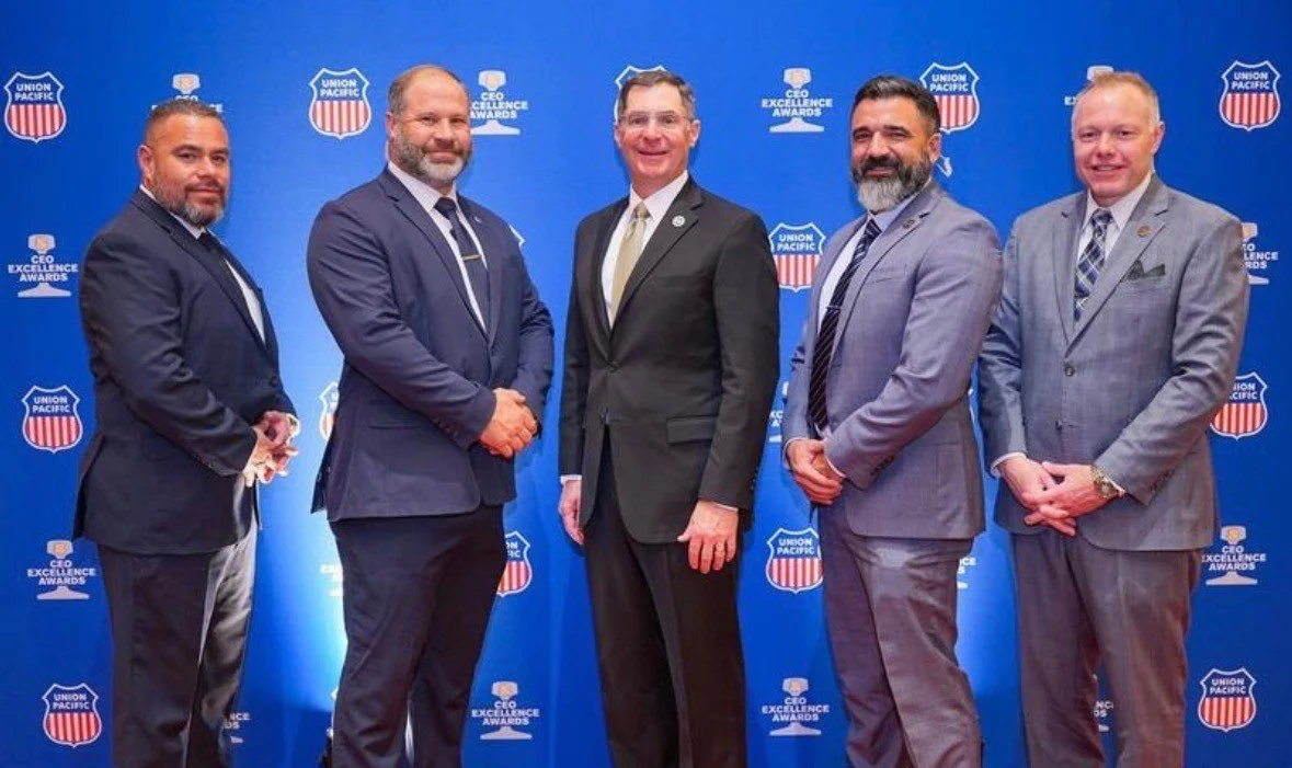 Union Pacific Railroad Executive Protection Team. Left to right: Special Agent Raymundo Velarde, Special Agent Jack Bartlett, ,Vice President of Safety Rod Doerr, Special Agent John Calvin, Special Agent Aaron Parsons.
